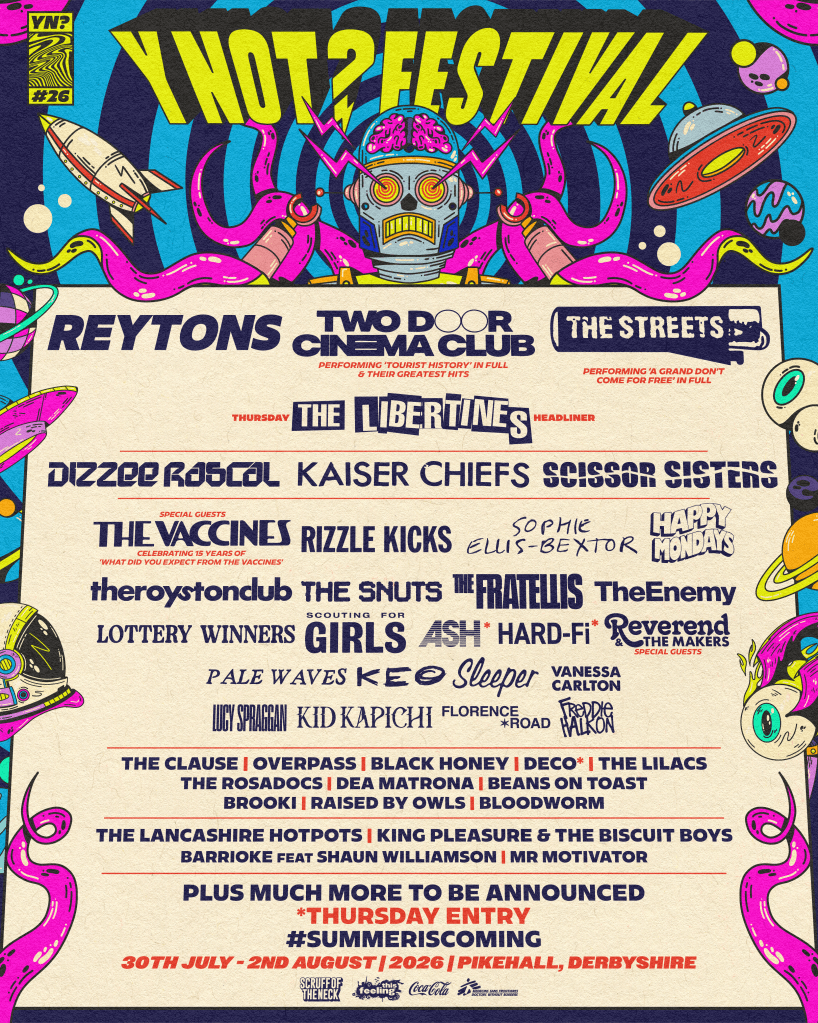 Y Not Festival have revealed their headliners for 2026, alongside the first wave of what’s set to be a huge line-up. The nineteenth edition of the North’s prime festival is back from 30th July to 2nd August. The Libertines will get the party started on Thursday, before a massive weekend of hits from headliners Reytons, Two Door Cinema Club and The Streets.